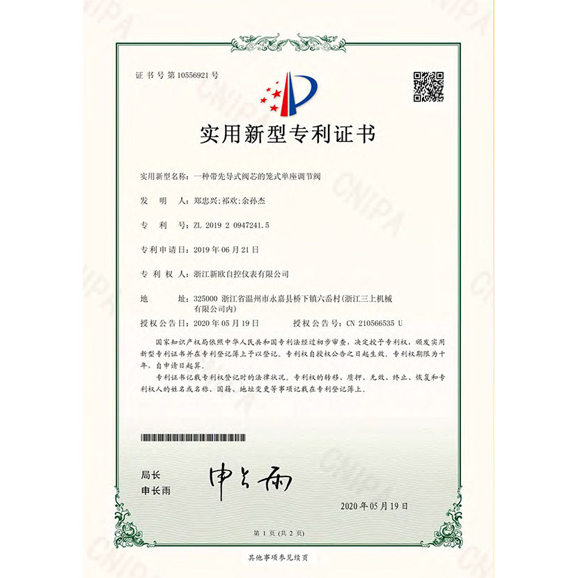 一種帶先導(dǎo)式閥芯的籠式單座調(diào)節(jié)閥 專利證書